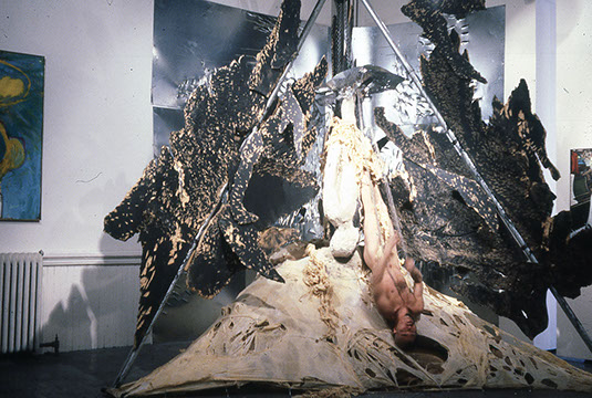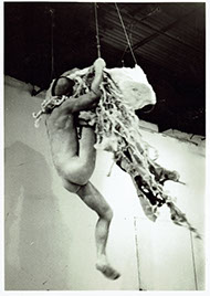 In 1975 after he adopted the name ‘Cusi Masuda,’ a tribute to the Romanian artist Brancusi, he did a one man performance show at the 14 sculptor’s gallery at Thompson St, in Soho, and also a one man sculpture installation show at Azuma gallery in SoHo. In the same year, Cusi held a street performance in SoHo titled "Eat Yourself", right on Spring and West Broadway for an art festival. In collaboration with Ushio Shinohara ” 篠原有司男” who was influenced by leading influential japanese avant-garde post war artist Taro Okamoto “ 岡本太郎” and Shinohara was one of the main leaders of NEO DADA Movement in Japan in the mid 1960’s along with Hiraoka Hiroko "平岡弘子”, Kishimoto Kiyoko "岸本清子”, Yoshimura Masunobu “吉村益信”, Masuzawa Kinpei “升沢金平” , Toyoshima Soroku (豊島壮六), Santaro Tanabe “田辺三太郎” Shintaro Tanaka “ 田中信太朗, Kazakura Sho "風倉匠”, Tatsumi Yoshino ”吉野辰海” and Shusaku Arakawa, “荒 川修作” Shinohara showed first two weeks, followed by Cusi’s two weeks sculpture installation at Azusa galley. 1977 he starts art show performance in his own studio, “75 Hudson Performing Space”, where he continues to show four times every two years times until the mid 80’s.